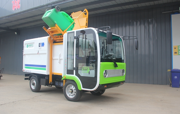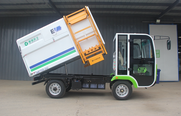 3.車箱為加厚熱板材質加設軌道滑輪提升機構,按鈕式操作可自動提升120L/240L標準垃圾桶;箱體右側設有小型投料口,方便零散垃圾的投放。尾部斜坡物理防水設計,加設密封膠條,保證無